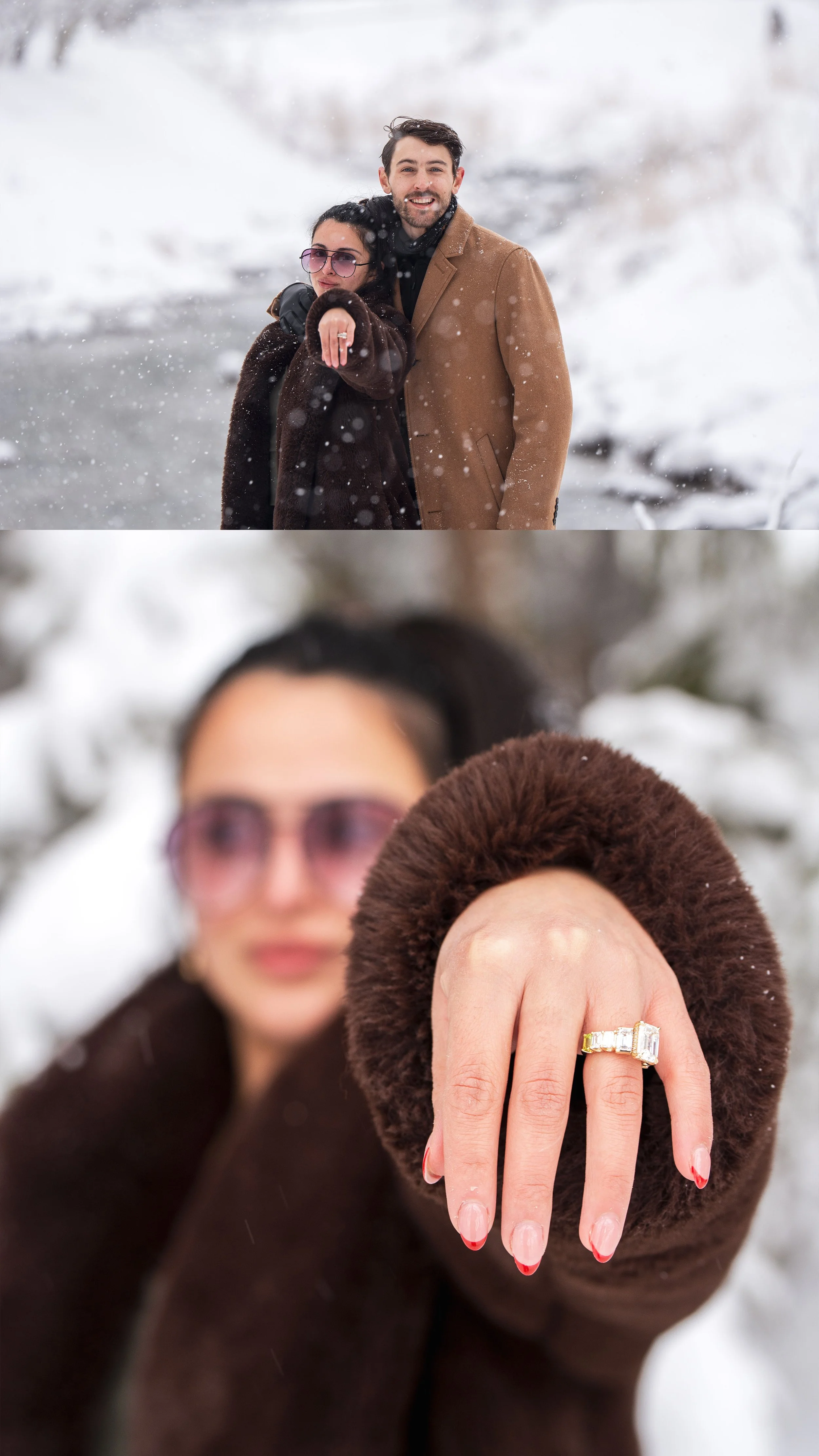 Surrounded by snow-covered trees and soft winter light, he got down on one knee — completely catching her by surprise. The reaction was pure joy, tears, and an unforgettable yes.