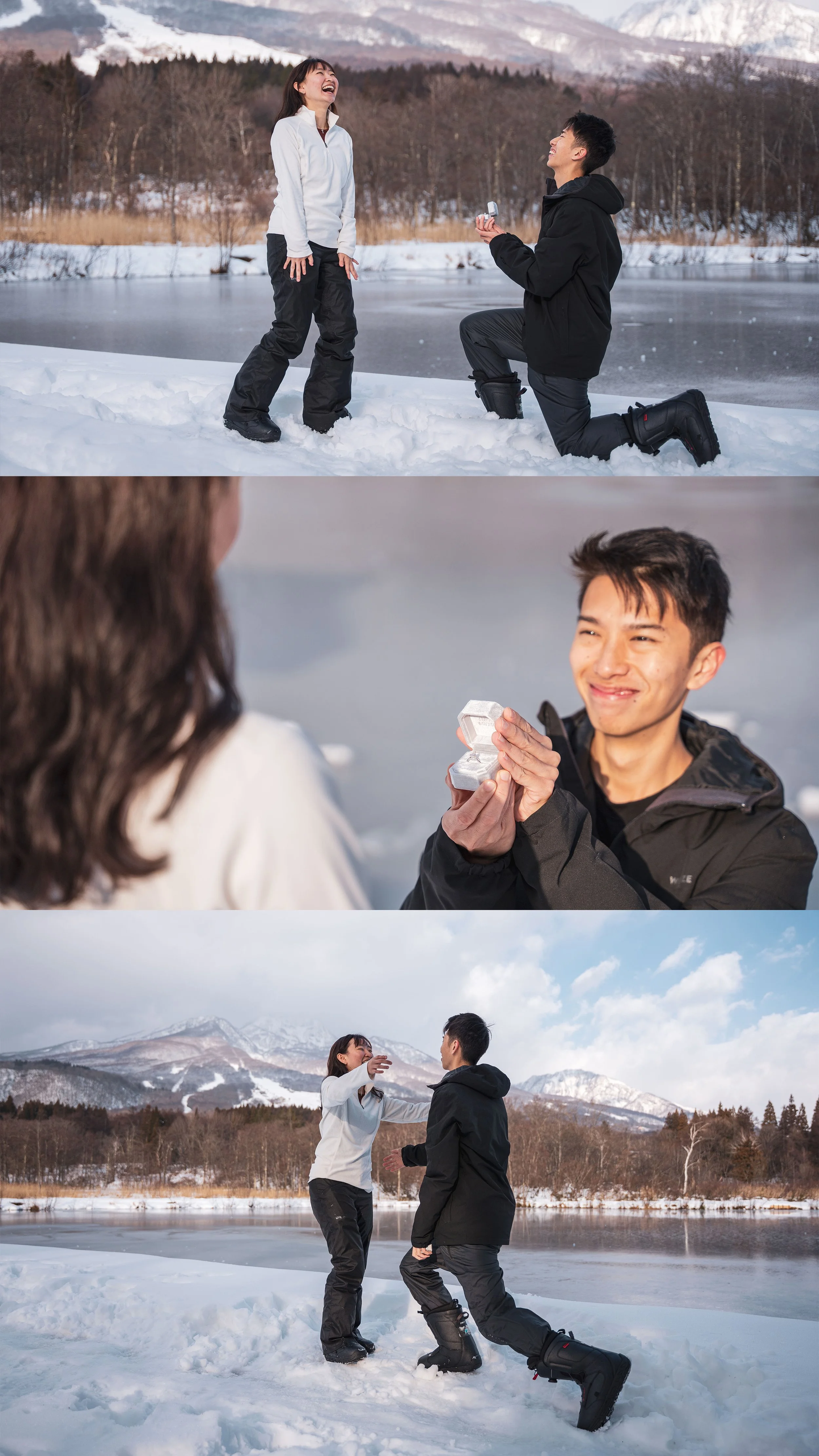 The proposal took place in a calm, scenic location, giving the couple space to truly enjoy the experience while we discreetly documented every genuine reaction. Myoko’s snow-covered trees, open views, and clean winter tones provided a timeless backdrop for this once-in-a-lifetime memory.